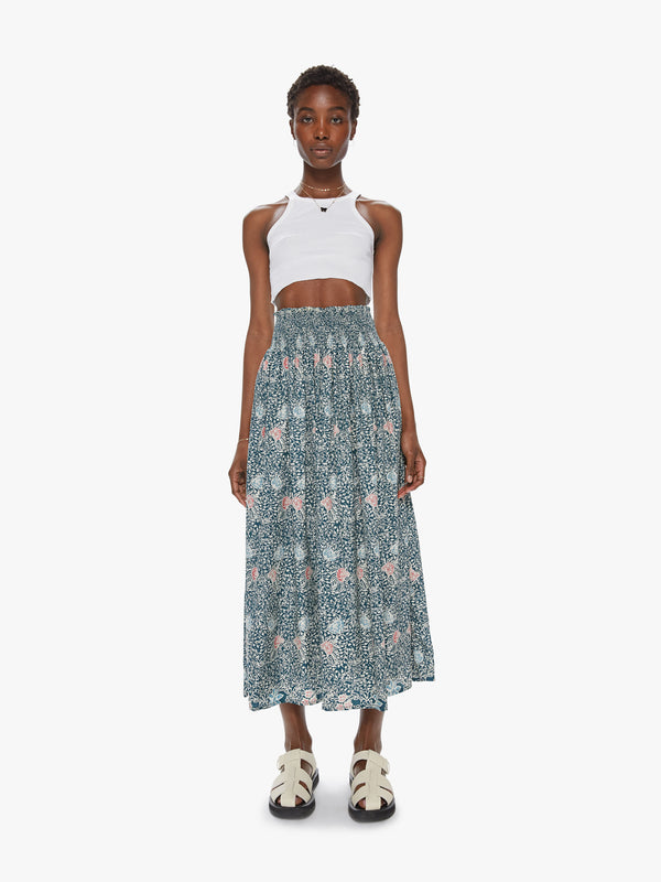 Coasting. A maxi skirt from Natalie Martin, a Los Angeles brand that creates effortless, bohemian garments. The silk skirt features an Aegean Sea-inspired floral print with a smocked waistband and a loose, flowy fit. It's recommended for sizes XS to L.